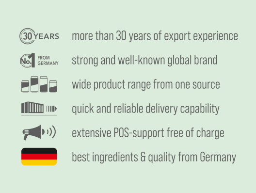 As a German exporter, we bear responsibility and are committed to the responsible handling of alcoholic beverages within the framework of legal regulations. The following pages contain advertising information on alcoholic beverages. Therefore, we ask you to indicate whether you are at least 18 years old.